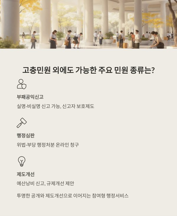 국민권익위원회는 고충민원 외에도 다음과 같은 주요 민원 처리를 담당합니다.