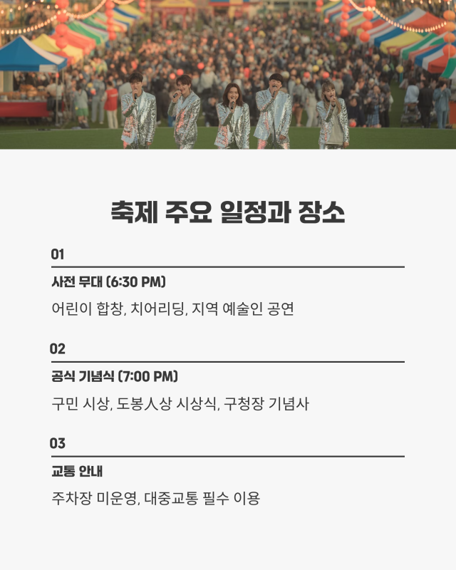 공식 기념식 후에는 화려한 무대가 펼쳐지며, 구민 모두가 즐길 수 있는 다채로운 공연이 이어집니다.