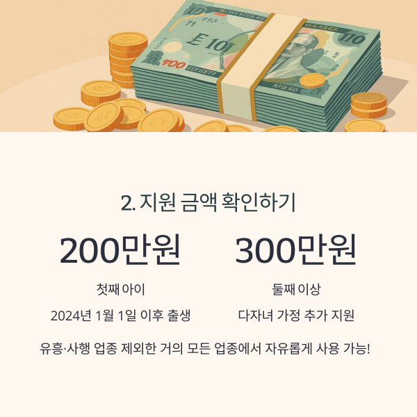 지원 금액 | 2024년 1월 1일 이후 출생아 기준, 첫째아 200만 원, 둘째아 이상 300만 원 |